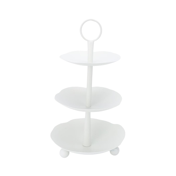 Diese elegante Etagere besteht aus drei weißen, runden Etagen, die auf einem stabilen Mittelpfosten montiert sind. Jede Etage hat eine leicht gewellte Form, die dem Design einen Hauch von Raffinesse verleiht. Die Etagere ist mit einem praktischen Tragegriff ausgestattet, der das Transportieren erleichtert. Ideal zum Servieren von Kuchen, Gebäck, Obst oder kleinen Snacks bei besonderen Anlässen oder zur stilvollen Präsentation in Ihrer Küche.