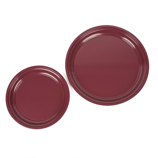Schlichte, runde Metalltabletts in Brombeer, erhältlich in zwei Größen. Die Tabletts überzeugen durch ihr zeitloses Design und sind vielseitig einsetzbar – ideal für Dekorationen, Servieren oder als Unterlage.