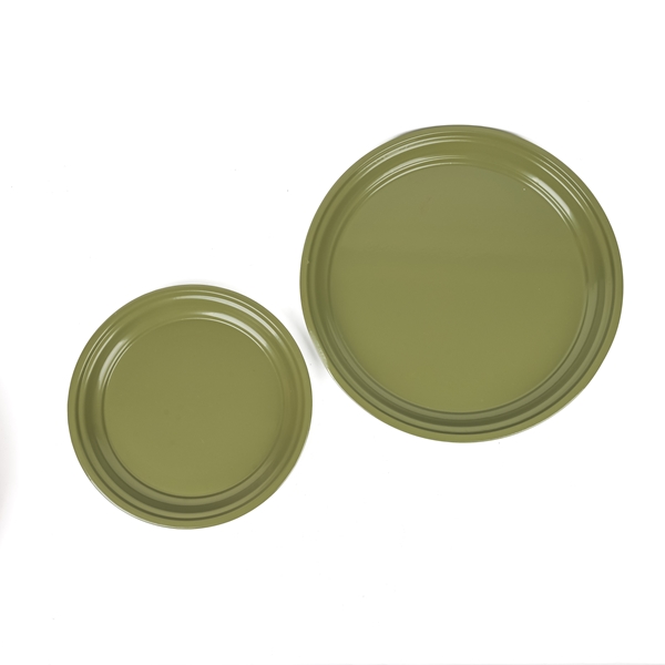 Plateaux métalliques ronds et plats en vert olive, disponibles en deux tailles. Les plateaux convainquent par leur De intemporelSont polyvalents.