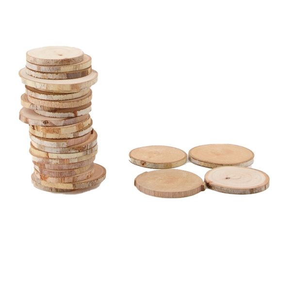 Disques en bois dans un paquet de 25 pièces. Ils mesurent 5 à 7 cm de diamètre et peuvent être utilisés de différentes manières.