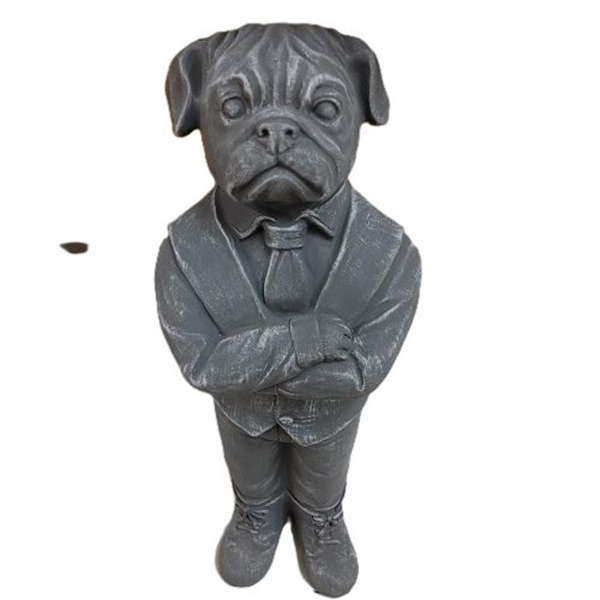 La statue riche en détails montre un chien avec un costume, une cravate et les bras croisés en gris. Idéal comme accessoire de maison original ou cadeau pour les amoureux des chiens.